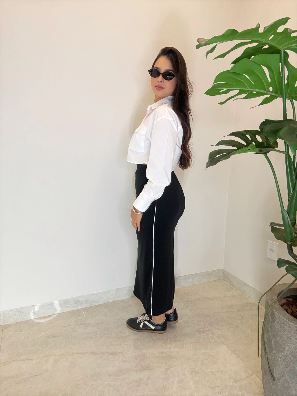 Saia canelada saia é uma peça versátil, combina com looks para o dia e para a noite. Com modelagem que desenha o corpo, e fenda atrás, possui detalhe em listra lateral. Disponível em 2 cores atemporais: marrom e preta